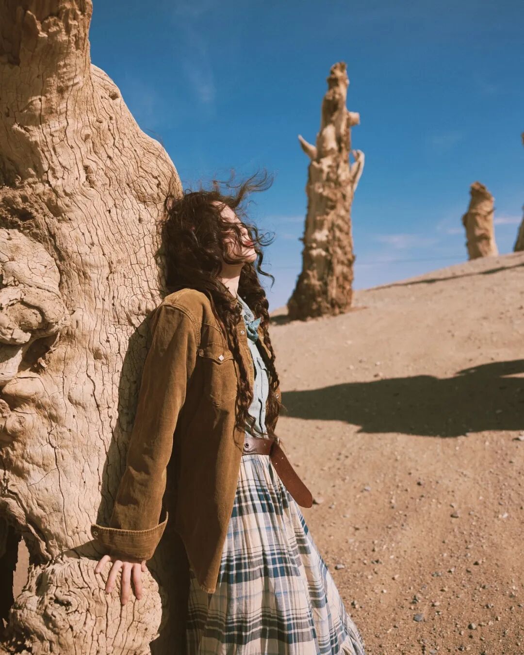 而在氛围更更放松的音乐节,她就会选择飘逸裙子+牛仔裤的组合,打破常规的叠穿,很搭她艺术生的随性气质。▼