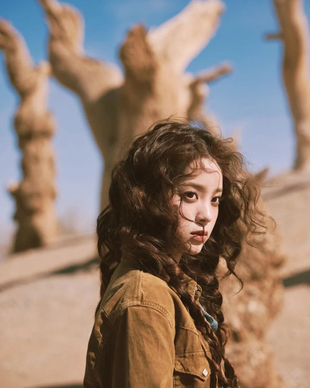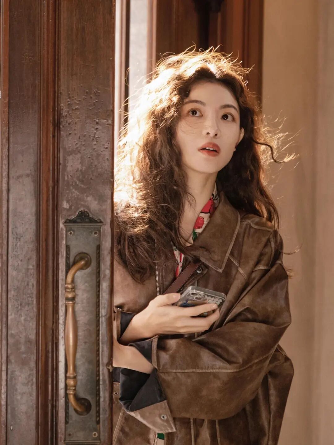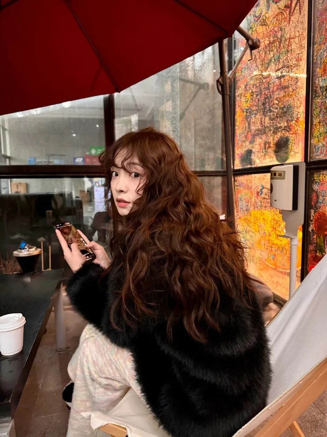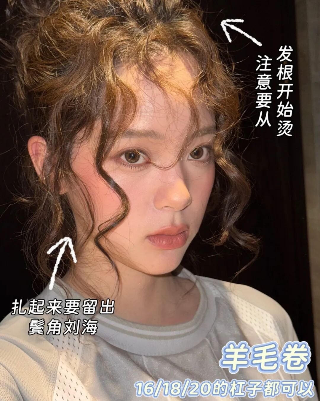 比起直发造型,羊毛卷的造型自带蓬松度和复古感,拍照特别上镜、容易出片。蓬松的卷度还能实现“头包脸”的效果,特别显脸小。▼