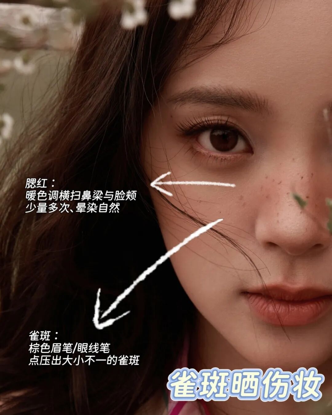 雀斑晒伤妆没那么日常,更适合周末去玩、假期去旅游时化这个妆,尤其搭配民族风服饰和首饰。