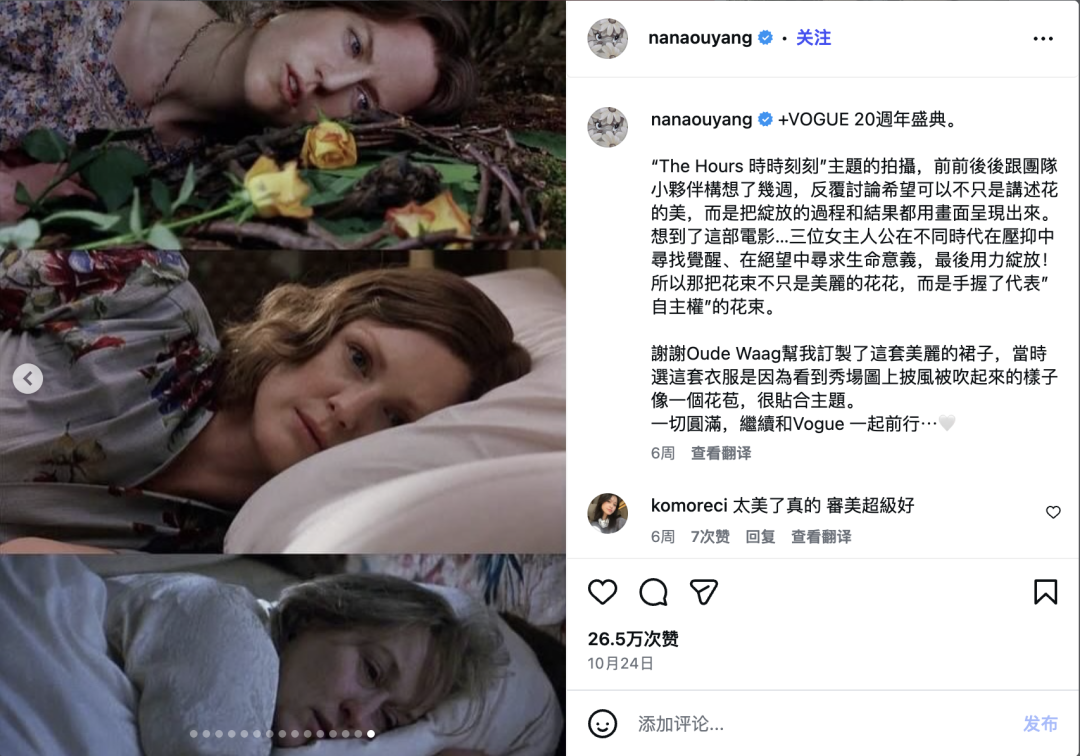 无论是化身《了不起的盖茨比》里走出来的流光溢彩的黛西,还是变身Vogue花园中那个赤脚奔跑的“绿野仙踪”精灵,这些出圈的造型她都参与到前期的构思,甚至还会找参考图、做ppt来阐述自己的想法。