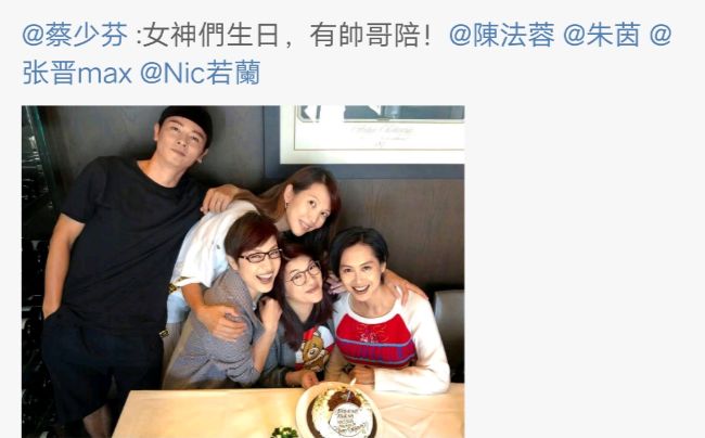 蔡少芬也晒出了跟朱茵、陈法蓉等闺蜜的大合照,调皮地说道“女神们生日,有帅哥陪”。