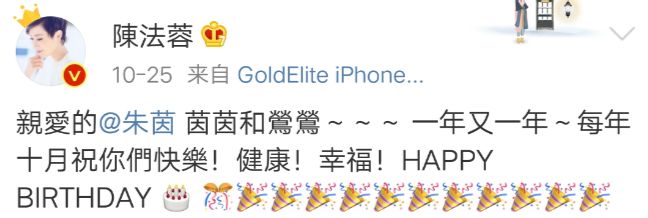 好友陈法蓉发微博祝福:一年又一年,每年十月祝你们快乐、健康、幸福。