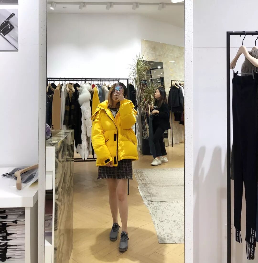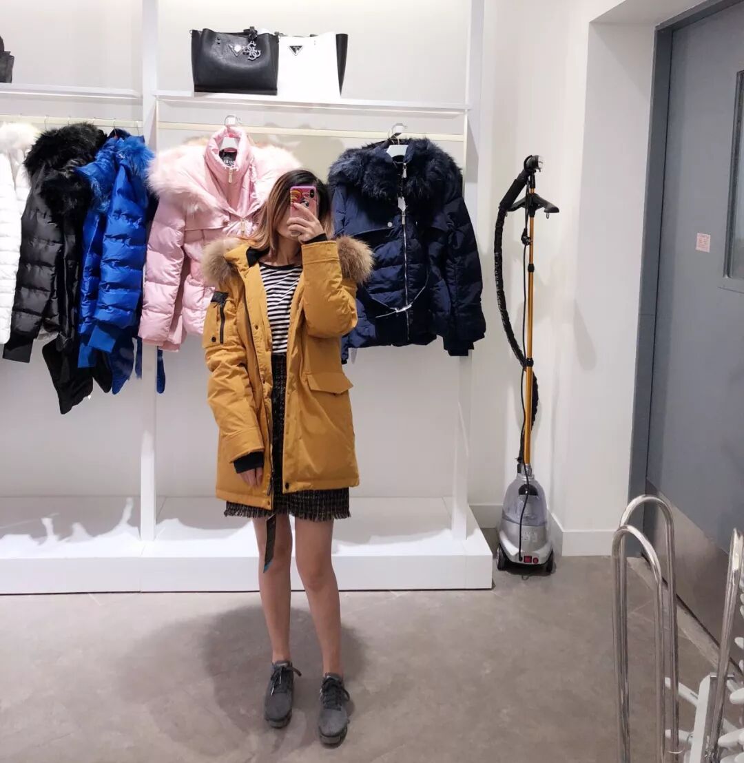 我最喜欢的就是下面这件姜黄色的派克羽绒服,现场试了下,很显白,穿着去冰天雪地的地方超醒目的。