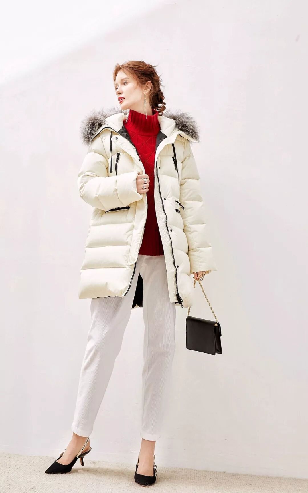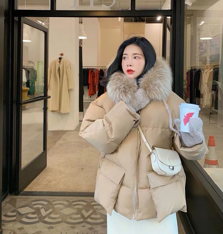 这种长度的羽绒服,里面搭配高腰的裙子,再配个长筒靴,露出一点点肉还挺好看滴~