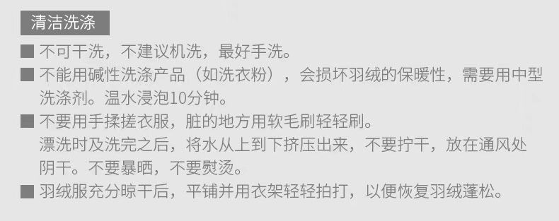 不能浸泡,不能用碱性的洗涤用品,因为会破坏羽绒表面的脂肪保护膜,导致降低羽绒的保暖性。