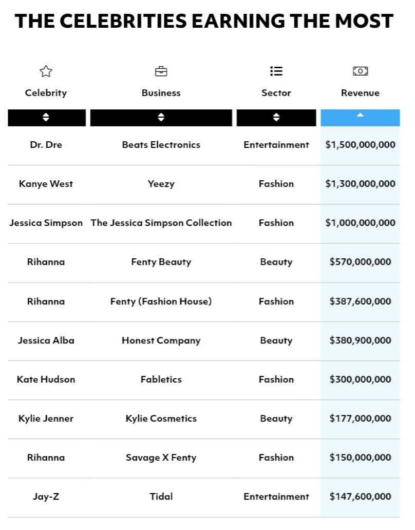 最近,2020年十大明星自创品牌公布! 这个榜单以统计明星自创品牌的营业额为主,统计出了2020年最受欢迎的前十名 。 其中第一名的是Dr. Dre依靠Beats by Dre耳机品牌的营业额十五亿美元占领榜单第一位。 Beats by Dre耳机应该都不用介绍了,毕竟它是这个星球最火的时尚耳机品牌,不仅音质好造型也非常时尚,已经成为耳机中的潮牌。 当然我比较惊讶的是Dr. Dre 还真的是挺低调的,他的品牌几乎跟他个人形象分离,品牌都请其他明星来宣传,很少听到他本人的消息,也没听到他本人的情感生活。 第二名则是侃爷Kanye West和ADIDAS合作的Yeezy系列,对此 I do not want to comment,只能说ADIDAS真的很厉害,侃爷遇到这样的合作伙伴算他的运气好了。 女子第一为00年代女歌手Jessica Simpson 其个人成衣服装品牌销售额高达十亿美元。 说到Jessica Simpson,很多人都会想到P!nk的那首骂她的歌《So What》,故事好像是两人有抢男人的纠纷,当时年少轻狂撕逼了一段时间,歌曲中写到:“The waiter just took my table, And gave to Jessica Simpshit..” 在当时Jessica Simpson是一位挺有名的音乐偶像歌手,她的声线雄厚而且现场可以一比一还原,曾被视为Mariah Carey的接班人。 不过Jessica Simpson后来发现自己更喜欢做生意,成为了一个段位很高的女企业家,Jessica Simpson的个人品牌是一个时尚的服装品牌。除了服装,该品牌还包括手袋、太阳镜、配件、珠宝、鞋子和香水。该品牌最初于2005年与Nine West联合创始人文斯·卡穆托(Vince Camuto)合作推出,至今十五年依然热卖。 该品牌已在全美650家百货公司销售,包括高档的Lord&Taylor和Belk以及普通的梅西和Dillard's,成为最畅销的名人服装品牌。 Rihanna则三项入榜,分别是内衣SAVAGE X FENTY(一亿五千万美元),成衣FENTY COLLECTION(三亿八千七百万美元)和美妆FENTY BEAUTY(五亿七千万美元)。 此外Jessica Alba和Kylie Jenner的美妆品牌都算热门,都在2020年销售破亿,不过今年Jessica Alba的品牌表现更强一些,可能是因为大集团的运营更强。 该榜单中一共有五位歌手,其中只有Kanye和Jay-Z 还算勤勤恳恳仍然在做音乐。 而Jessica Simpson因为品牌生意比较好,2008年以后,她决定此生此世不再推出任何音乐作品,专业做时尚品牌了。 而至今即便没有任何作品的加持,她的个人品牌依然在赚大钱,十亿美元的销售额基本上等于一亿张专辑销量的销售额了。 确实全身心的加入创业者的行业是非常重要的,为了品牌放弃她早年最爱的音乐,专注确实是她成功最大的一个因素。 不过比起做音乐,做品牌还是更好的路子,按照Jessica Simpson来说,她的Instagram上只有五百多万粉丝,或许推出音乐也不能反响很大。 但做品牌年销售额高达十亿美元,这样的收入对她的孩子和她孩子的孩子,她的整个家族都是非常有贡献的。 以此类推,Rihanna的下一张专辑可能遥遥无期了。
