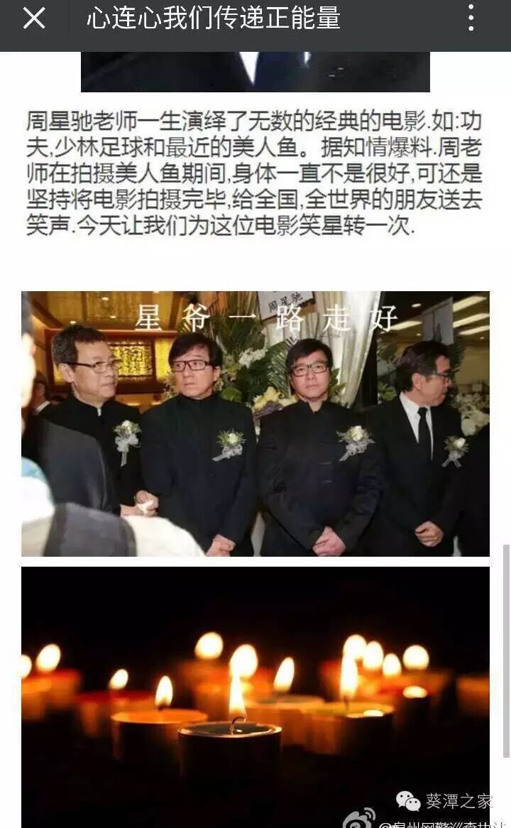 #将打谣进行到底# 【网传周星驰5月9日上午在香港因病去世系谣言】近日,多个微信公众号发布信息称周星驰于2016年5月9日上午在香港因病去世。经核实,该消息为谣言!贴文内的图系午马出殡时,成龙等影星扶灵照片。