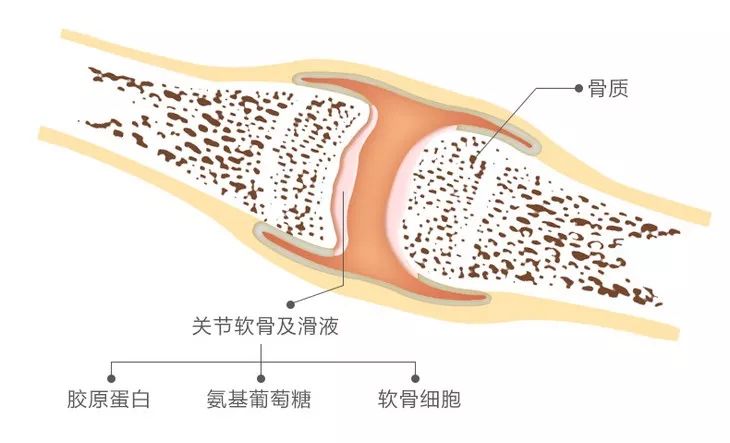 我们从上图可以了解到,关节软骨以及滑液的主要成分是胶原蛋白、氨基葡萄糖(也就是氨糖)、软骨细胞。