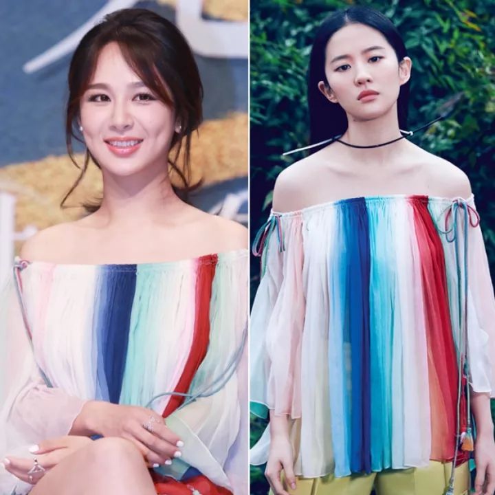 娱乐圈里,撞衫是常事,神仙姐姐刘亦菲和杨紫小姐姐都穿过同一款彩色的露肩上衣,刘亦菲穿上它显得很有灵气,而杨紫穿上身就多了一份俏皮而活泼的气息。