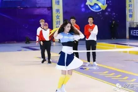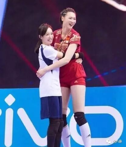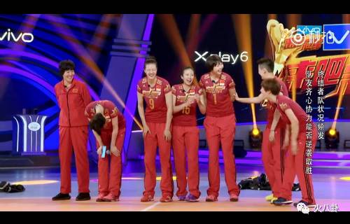 旁观的郎平教练和女排姑娘们已经笑得前仰后合……