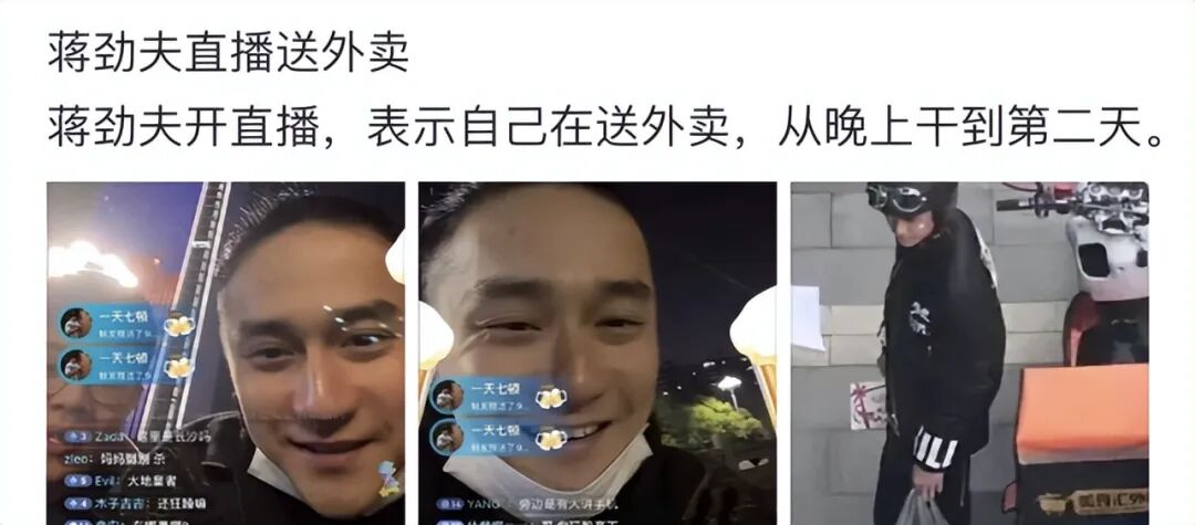蒋劲夫直播近况曝光,转行送外卖很乐观,眼窝深陷皱纹多显憔悴。其实无论蒋劲夫是不是真的送外卖,不少粉丝们都安慰蒋劲夫只要自己开心快乐就好。尤其是自己靠自己的力量和努力赚钱,这也没有什么不妥。我们也希望蒋劲夫能够开心生活,好好经营自己的生活,不要虚度浪费时光。