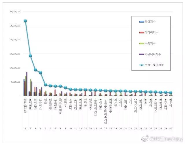 27日根据韩国企业评判研究所方面公开的最新数据,针对3月25日至4月26日期间的百大偶像组合144,879,220条品牌大数据进行分析,组合防弹少年团以26,717,936的品牌评判值摘得4月份百大偶像组合品牌评价1位。另外2位~5位则分别由BLACKPINK、IZONE、TWICE、EXO占据。