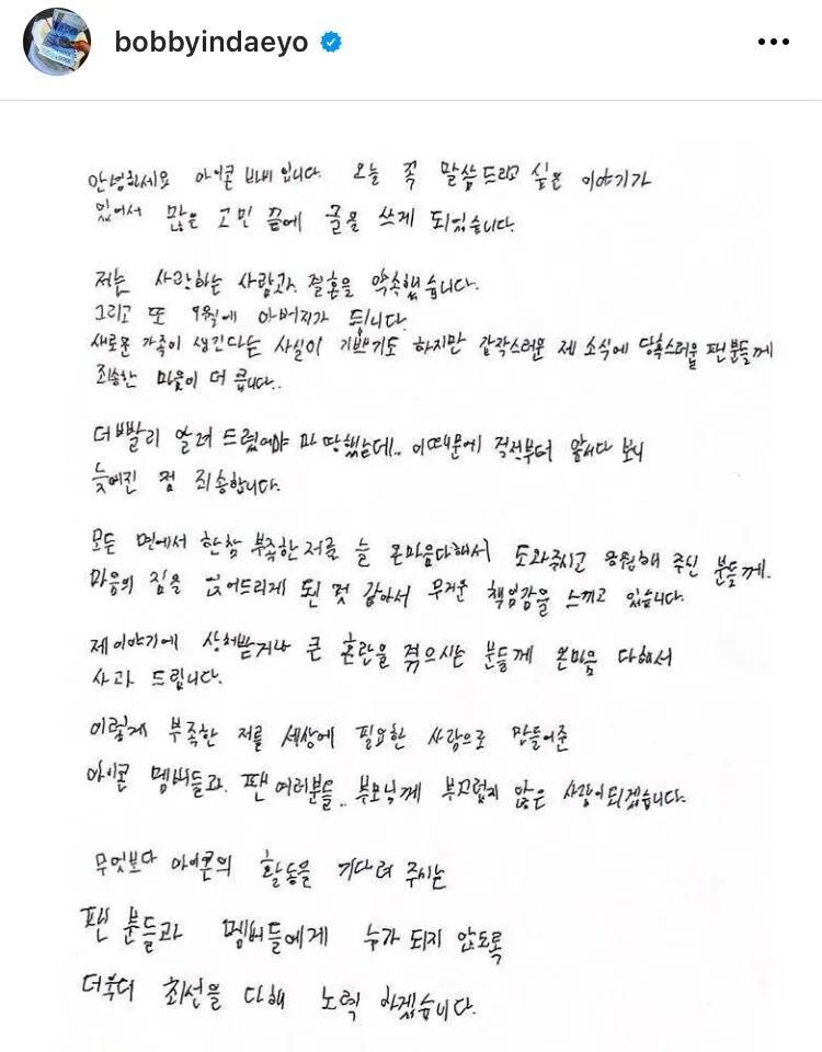 昨日晚iKON成员Bobby在个人INS上传亲笔手写信,亲自传达了自己即将结婚和9月成为爸爸的消息。