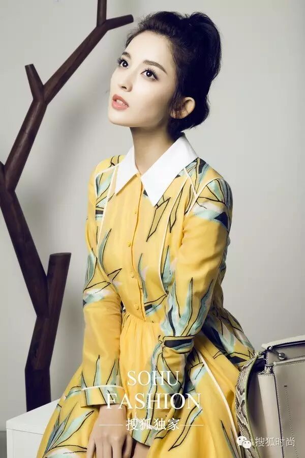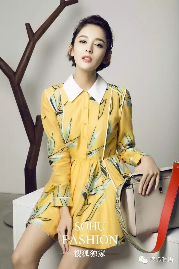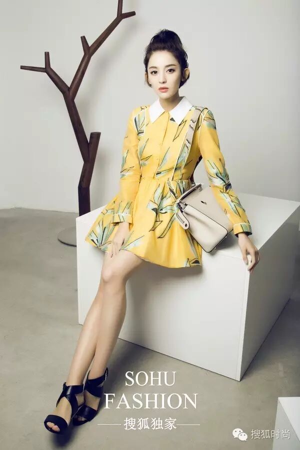 古力娜扎清新可人,穿上鹅黄底色翠绿印花长裙,更似狄安娜女神降临,带来暖暖春风。蟒蛇皮与小牛皮的拼接皮质包带增加些许风情,图案亦不落入俗套。