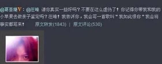 也是在那一年,葛荟婕火力全开炮轰汪峰,导火索是汪峰要求跟小苹果做亲子鉴定,葛荟婕认为自己受到了人格侮辱。