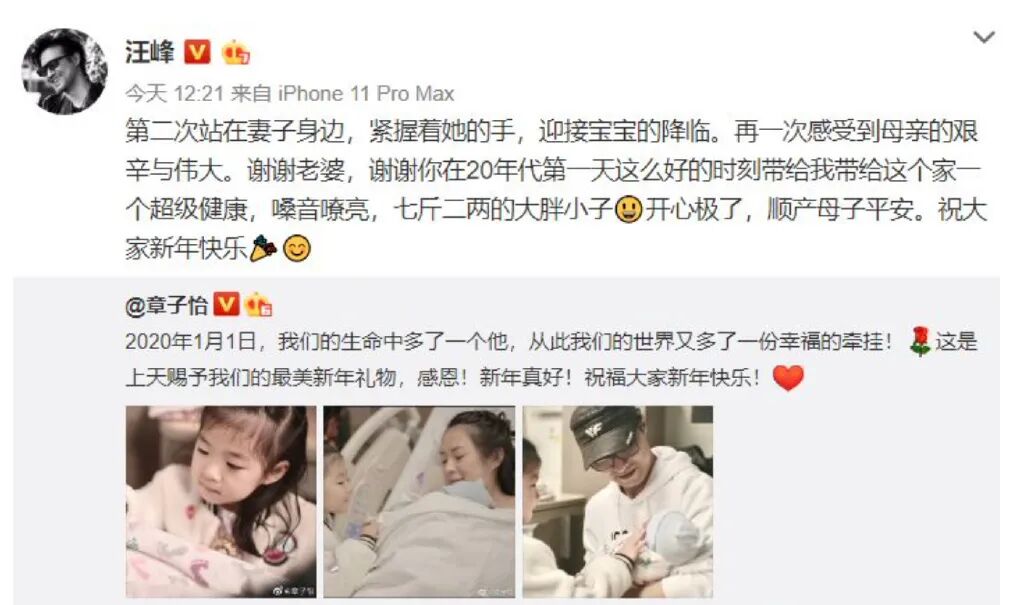 2020年1月1日,章子怡和汪峰通过社交平台公布了小儿子出生的喜讯。但由于当时正值疫情期间,二人并没有太过高调地宣传,这也是为什么很多人不知道他们还育有一子的原因。