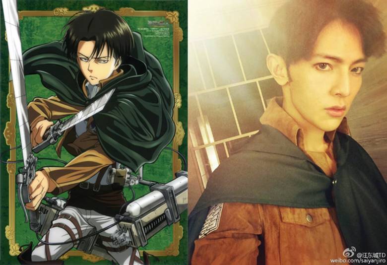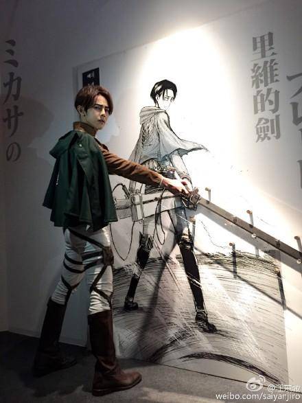 这张照片是汪东城在台北松烟文举办的《进击的巨人》展拍的,身着与兵长同款的调查兵团制服,没有带假发,因原作中兵长的身高只有160所以汪东城要高出许多,但是还是引起当时的女粉丝尖叫连连。