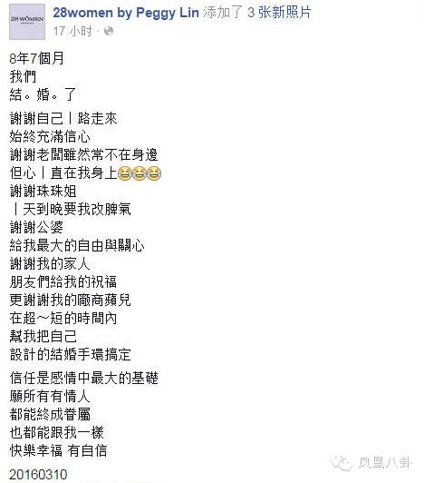 据悉,何润东并没有刻意去求婚而是直接去签字结婚,女方也在社交网站上宣布自己结婚了。恋爱8年,准确的说是8年7个月,将近9年的时间。