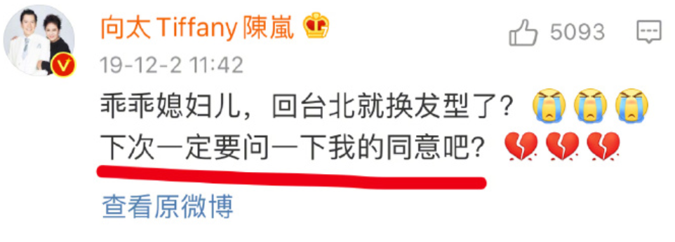 比如之前郭碧婷换发色,向太有在微博留言:乖乖儿媳妇,下次一定要问一下我的同意吧?