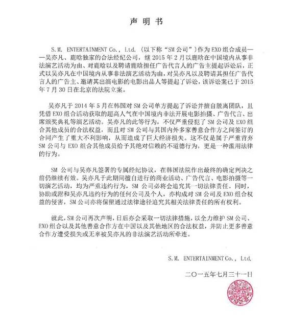 SM起诉吴亦凡及广告商今日立案 5月已起诉鹿晗 内地男星 2016-05-21 14:38:42 142 创作不易,用心坚持,欢迎请BaGua喝几杯爱心咖啡!打赏并支持本文 打赏并删除本文 吴亦凡韩国男团EXO前成员吴亦凡和鹿晗相继向韩国SM娱乐公司提出解约后,目前未能与EXO所属的韩国SM娱乐公司达成协议。继5月向鹿晗及广告商起诉后,今日, SM娱乐经纪公司发表声明称,针对在中国境内擅自从事演艺活动的吴亦凡以及使用吴亦凡作为广告代言人的广告主、邀请其出演电影的电影出品人等提起诉讼,已于2015年7月30日在北京的法院立案。鹿晗5月20日20点11分,北京市海淀区人民法院官方微博发布SM起诉鹿晗侵权纠纷的案件播报,称海淀法院受理韩国S.M.Entertainment公司诉鹿晗侵权纠纷,“因认为艺人鹿晗与韩束公司、普缇客公司擅自开展合作,侵害了其享有的专属经纪利益,S.M.Entertainment公司将鹿晗、韩束公司、普缇客公司诉至法院,要求停止侵害、公开声明、消除影响。日前海淀法院受理了上述案件。”独家解密吴亦凡,EXO组合成员,同时也是主攻华语地区的小分队EXO-M的队长。长得帅、大长腿、富二代,还是个运动健将,当这些标签集中在一个人身上的时候,就很难让90后甚至00后的小女孩不去喜欢他。所以当他提出要和以苛刻著称的韩国SM娱乐公司解约时,小伙伴们都惊呆了。接下来的几天里,这出解约风波就像一场大戏,跌宕起伏、荡气回肠。然而,事实的真相永远不会像外界所描述得那么“美好”, 近日,一名知情人士向记者独家透露了几个与吴亦凡解约有关的小秘密,真是再好的编剧也写不出这样牛逼的剧本。解约原因竟是用“自残”新闻压另一负面?从外界公布的信息来看,解约事件中吴亦凡处于主动一方:5月15日,当红韩国男子组合EXO成员、小分队EXO-M队长吴亦凡(KRIS) 正式向首尔中央地方法院请求判决与所属经纪公司SM专属合同无效。原告属于弱势,令吴亦凡很快得到舆论同情,占据主动。但知情人士却说出了另外一个情况:吴亦凡并非真的想与SM解约,这条新闻出来的真正目的,是为了掩饰另外一个可能会影响整个EXO-M发展的负面消息。 这个会影响EXO-M的负面消息究竟是什么?知情人士表示实在不便透露。但是回顾去年以来关于EXO的新闻,负面消息时有传出。去年10月,EXO被爆经纪人对粉丝拳打脚踢。之后杜海涛跪拜权志龙事件里,EXO无辜躺枪,被愤怒的网友大喊“滚出娱乐圈”。而在今年4月,EXO新单曲《中毒》的音源与舞蹈视频皆被泄露在网络上,导致SM股价大跌。事实上,关于组合成员不和、与未成年女孩恋爱等传闻一直没有断过。今年以来,这种负面能量更波及整个SM,旗下艺人绯闻频出,境外逃税风波等等。知情人士说,吴亦凡此次是忍辱负重,身为EXO-M队长的他,为了保护其他成员,只能以解约这样的“自残”方式,来压过那条可能影响组合发展的负面消息。他始终强调,吴亦凡本意绝不是想解约,而这条解约传闻,其实是为了盖过另一条负面新闻的无奈之举。不想解约吴亦凡本意是不想解约,那为何事情会愈演愈烈,闹到现在要对簿公堂?消息人士指出,原本双方协商好,吴亦凡先提出解约,然后双方会庭外和解,吴亦凡依旧是EXO的成员。不过令SM公司没有想到的是,国内的经纪公司早就打起了EXO组合里几位中国男孩的主意,而高大帅气、拥有众多粉丝的吴亦凡,更是国内各大公司争相邀约的对象。15日传出解约消息没多久,一篇题为《吴亦凡:公司将我当做机器》的文章在各大网站出现,内文充斥着吴亦凡对SM公司非人道行为的控诉,更称吴亦凡虽然累得不行,但却拿不到应有的报酬,生活十分拮据。好吧,脑补一下,吴亦凡其实是个富二代,在他很小的时候,全家就移民加拿大了。吴亦凡生在一个大家族里,很多亲戚早年也都移民海外。与其说吴亦凡经济拮据,不如说他是一个啃老族,去年底吴亦凡曾在微信朋友圈晒出一双85年产的飞人一代篮球鞋,这双鞋目前在国内至少要5万人民币,还不一定能买到真货。言归正传,这篇文章表达的并非吴亦凡的真实想法。知情人士表示,这篇文章的内容被添油加醋了不少,授意其加料的幕后黑手很有可能是国内的经纪公司,这样做的目的显而易见,激怒SM,逼迫吴亦凡解约,然后回国当摇钱树。事实上,近两日关于吴亦凡的下家已经在媒体上被热炒,其中华谊和于正工作室最被看好。细想想,一个富二代会为了钱,放弃如日中天的偶像事业? 创作不易,用心坚持,欢迎请BaGua喝几杯爱心咖啡!打赏并支持本文 打赏并删除本文 感谢您的支持鼓励,我会继续努力的!文章地址:用户邮箱:打赏金额:USDT 请输入数字点击”去打赏“,即可进行打赏支持本文章哦 吴亦凡 发表评论