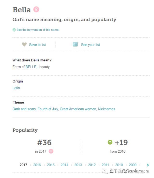 就可以看到bella是来自belle,寓意是美丽的,来自拉丁文,2017年在流行榜上排名36位,比2016年上升了19位。