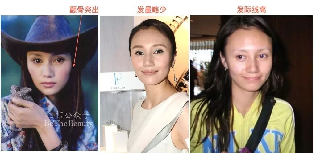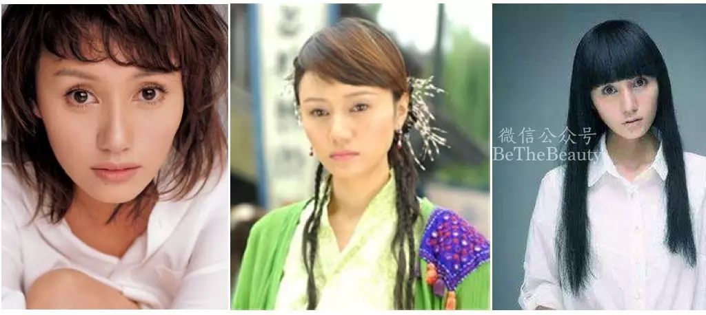 左三:袁泉先天发际线就比较靠上,头顶比较低,头发相对较为细软。