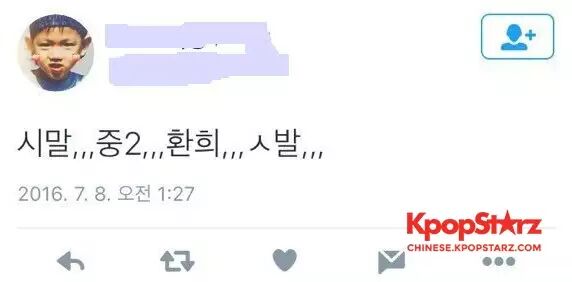 近日,在韩国论坛上热门帖子中有一个名为"对《哭声》15岁儿童角色说难听话的部分EXO粉丝"的帖子,在帖子上有网友贴出Twitter截图,EXO粉丝对于电影《哭声》中儿童角色金焕熙恶语相向:"啊,焕熙赶紧滚,这XX";"中学二年级,焕熙xx,"。