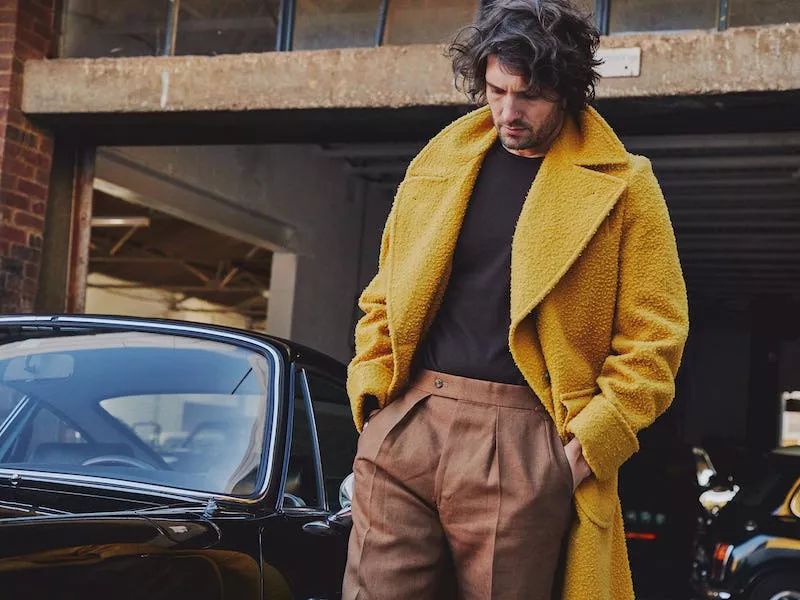 △一件简单的毛毛球大衣配上双摺裤,穿着效果就很好,羊毛Rubinacci外套; 棕色前褶亚麻裤; Anderson&Sheppard的巧克力色羊绒衫; James Munro摄。