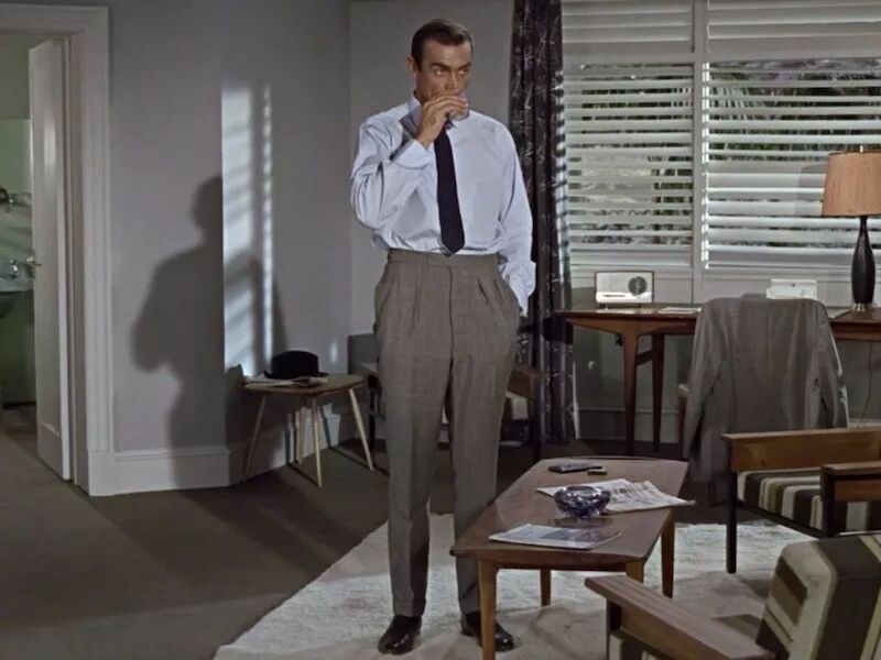 △肖恩·康纳利在1964年金手指饰演詹姆斯·邦德(James Bond)。康纳利去裁缝安东尼·辛克莱(Anthony Sinclair)定制西装,身穿的传统英式双褶皱裤。