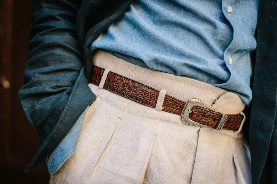 △定制的Edward Sexton象牙白法兰绒,前向双褶皱长裤,佩戴Cucinelli的鳄鱼皮腰带