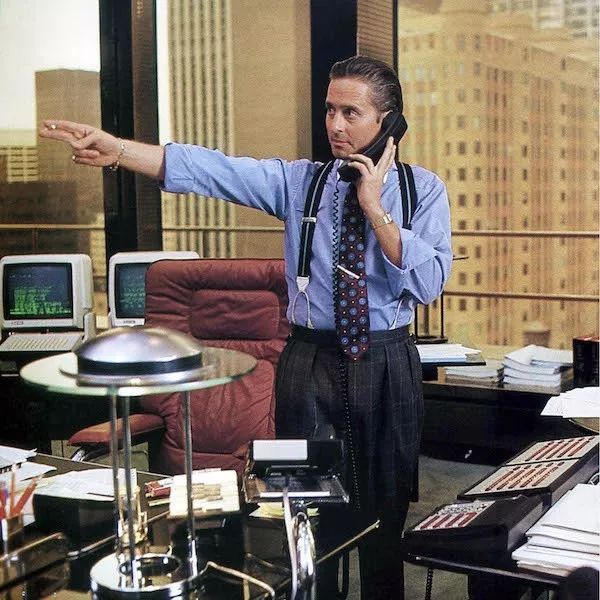 △迈克尔·道格拉斯在1987年的华尔街中经典形象 戈登·盖科 穿着双摺长裤并且配了双爪背带