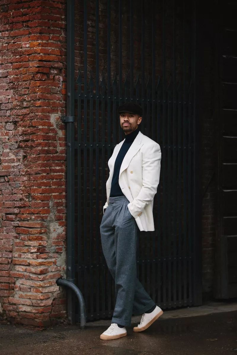 △乔纳森·爱德华兹(Jonathan Edwards)在波兰定制的服饰,用浅灰色反褶长裤。搭配一双休闲的帆布鞋。摄影:Jamie Ferguson。