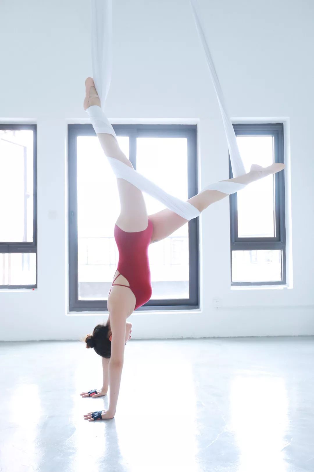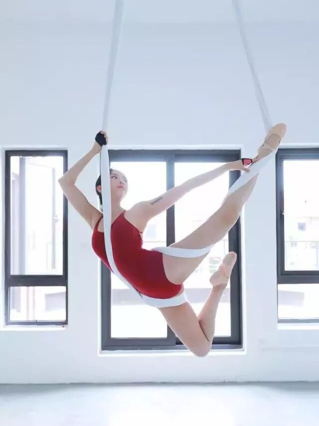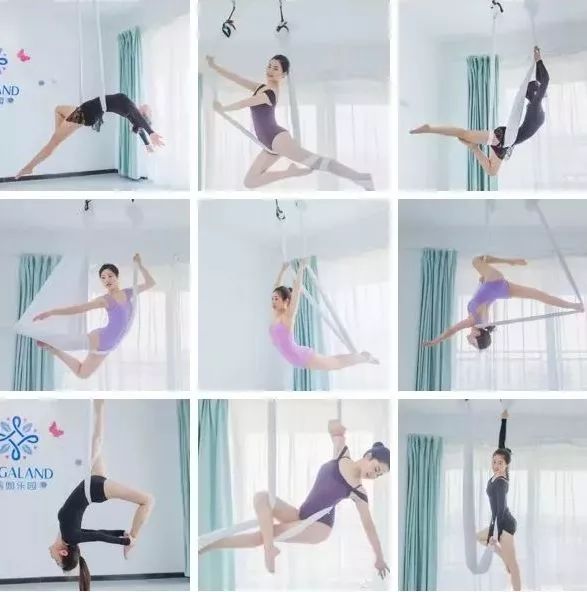 将很多空中瑜伽的体式流动编排,融入后翻、飞行、缠绕训练及动作的优美串联与组合,形成若干的空中小组合。
