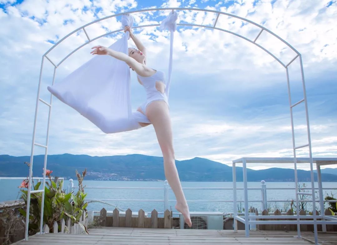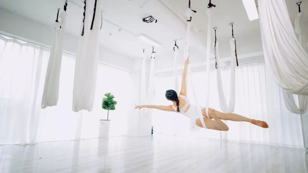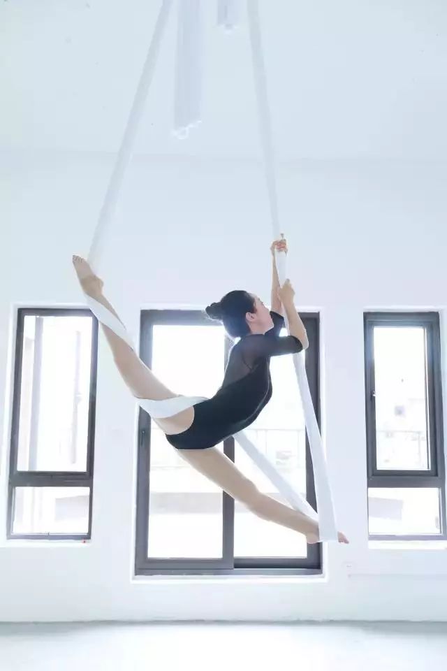空中舞韵瑜伽会在绸缎上做出各种悬空摆动,空中飞行,下坠滚动、攀爬、缠绕及悬挂等动作,锻炼全身的肌肉,领筋骨变得更加灵活。