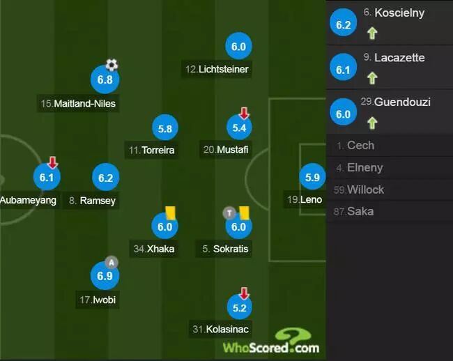 阿森纳(3-4-3):19-莱诺;12-利希施泰纳,20-穆斯塔菲(46',6-科斯切尔尼),5-帕帕斯塔索普洛斯;15-奈尔斯,11-托雷拉,34-扎卡,31-科拉希纳茨(80',29-贡多齐);17-伊沃比,14-奥巴梅扬(71',9-拉卡泽特),8-拉姆塞