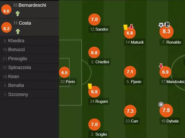 尤文图斯(4-3-3):22-佩林/2-德希利奥,24-鲁加尼,3-基耶利尼,12-阿莱士-桑德罗/23-埃姆雷-詹,5-皮亚尼奇,14-马图伊迪/10-迪巴拉,17-曼朱基奇(69'贝尔纳代斯基),7-C罗