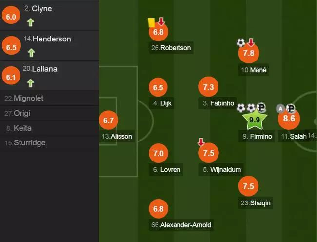 利物浦(4-2-3-1):13-阿利松;66-阿诺德,6-洛夫伦,4-范戴克,26-罗伯逊(83',2-克莱因);5-维纳尔杜姆(78',20-拉拉纳),3-法比尼奥;11-萨拉赫,23-沙奇里,10-马内(62',14-亨德森);9-菲尔米诺