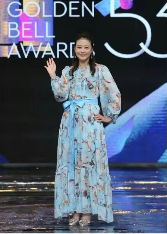 这次站在舞台上面,她身上穿了一条连衣裙,裙子的颜色是蓝色的,上面是一些碎花的设计,而且腰间有一根腰带,这样的话显得身材比例看起来就是比较的协调,并且下面还穿着一双高跟鞋