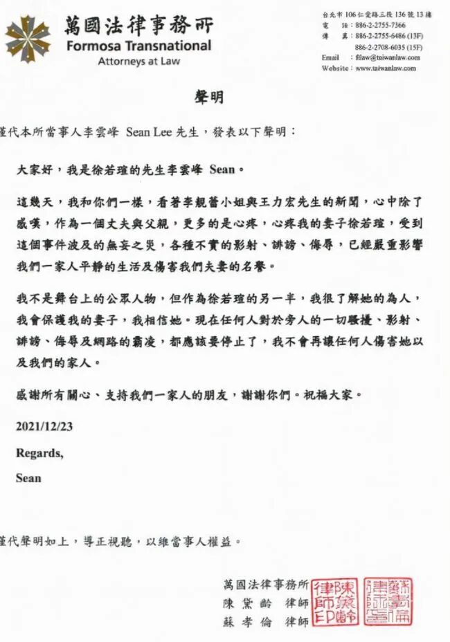 相关:徐若瑄再度发声明否认出轨王力宏:绝无私约,悲叹已身心疲惫