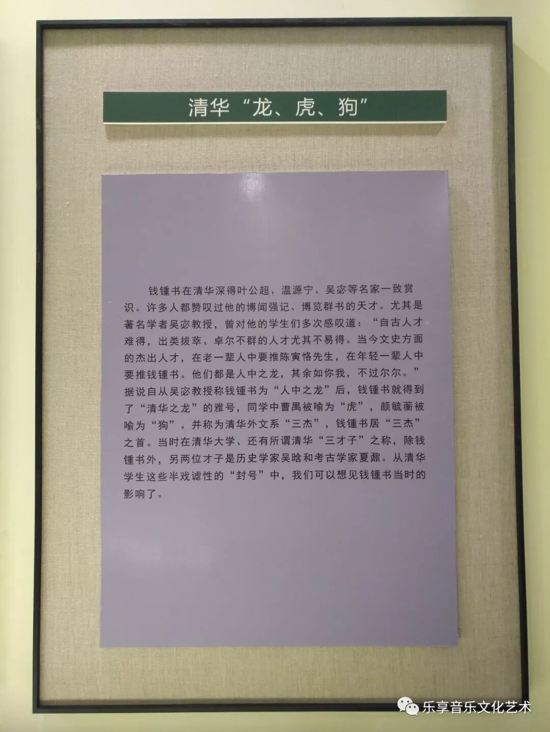 1929年钱锺书以优异成绩从无锡辅仁中学毕业,报考清华大学。他的数学成绩只有15分,但是国文和英文都是特优,英文还得了满分。罗家伦校长非常赏识钱锺书的才华,在他的力争下破格录取为外文系的学生。在清华的环境中,钱锺书吸收了大量知识,非常勤奋,是清华图书馆借书最多的一个。他自觉进行着中国文化和西方文化的学习和探索,极大的开阔了境界。以自己已经具备的学术功底和卓越才华震惊了全校的师生,许多老师都对他另眼相看,不把他当成他们的学生,而当成他们的顾问。钱锺书被誉为清华大学“三才子”之首,其他两位是考古学家夏鼐和历史学家吴晗;又是清华外文系“龙、虎、狗”“三杰”之龙,“龙”是钱钟书,“虎”是戏剧家曹禺,“狗”是颜毓蘅。