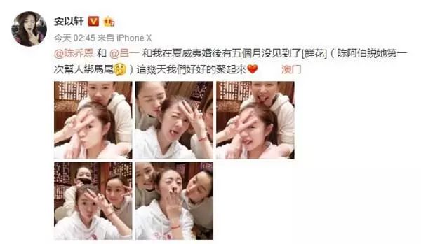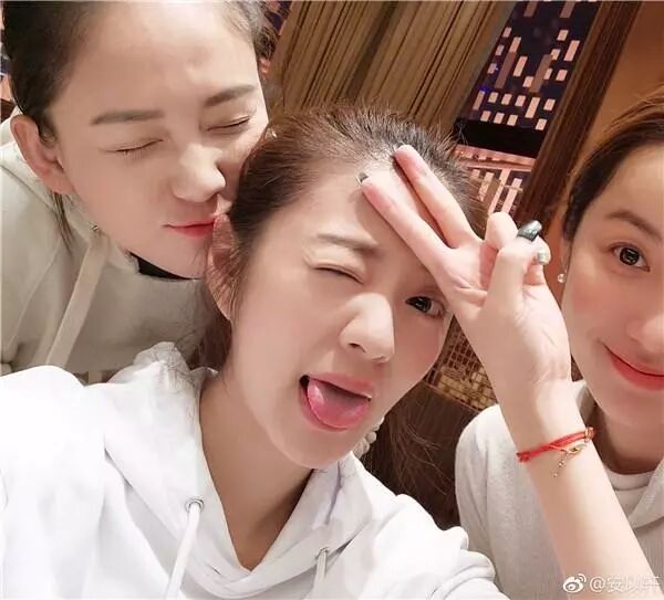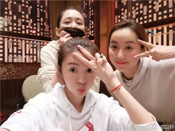 三个人的状态都很好啊,安以轩都在各种卖萌,吕一很可爱的比耶,而陈乔恩却只露出了半张脸,但是也挡不住她的美啊。