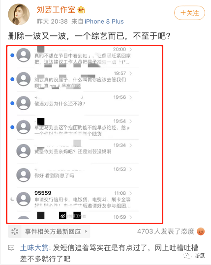 此前,刘芸工作室曾晒出网友的短信恶评,称:“删除一波又一波,一个综艺而已,不至于吧”。