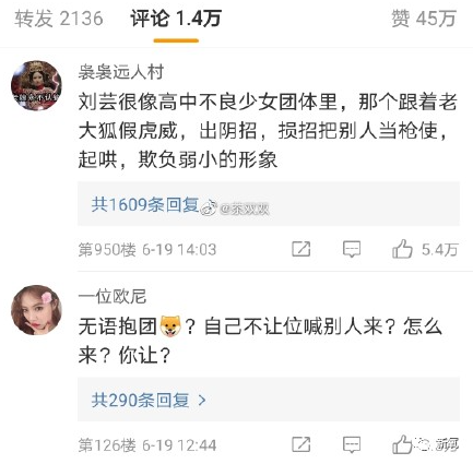 其中一位网友在骂“刘芸很像高中不良少女团体力,那个跟着老大狐假虎威,出阴招、损招把人当枪使,起哄,欺负弱小的形象”另一个网友直接炮轰:“无语抱团?自己不让位喊别人来?怎么来?你让?”