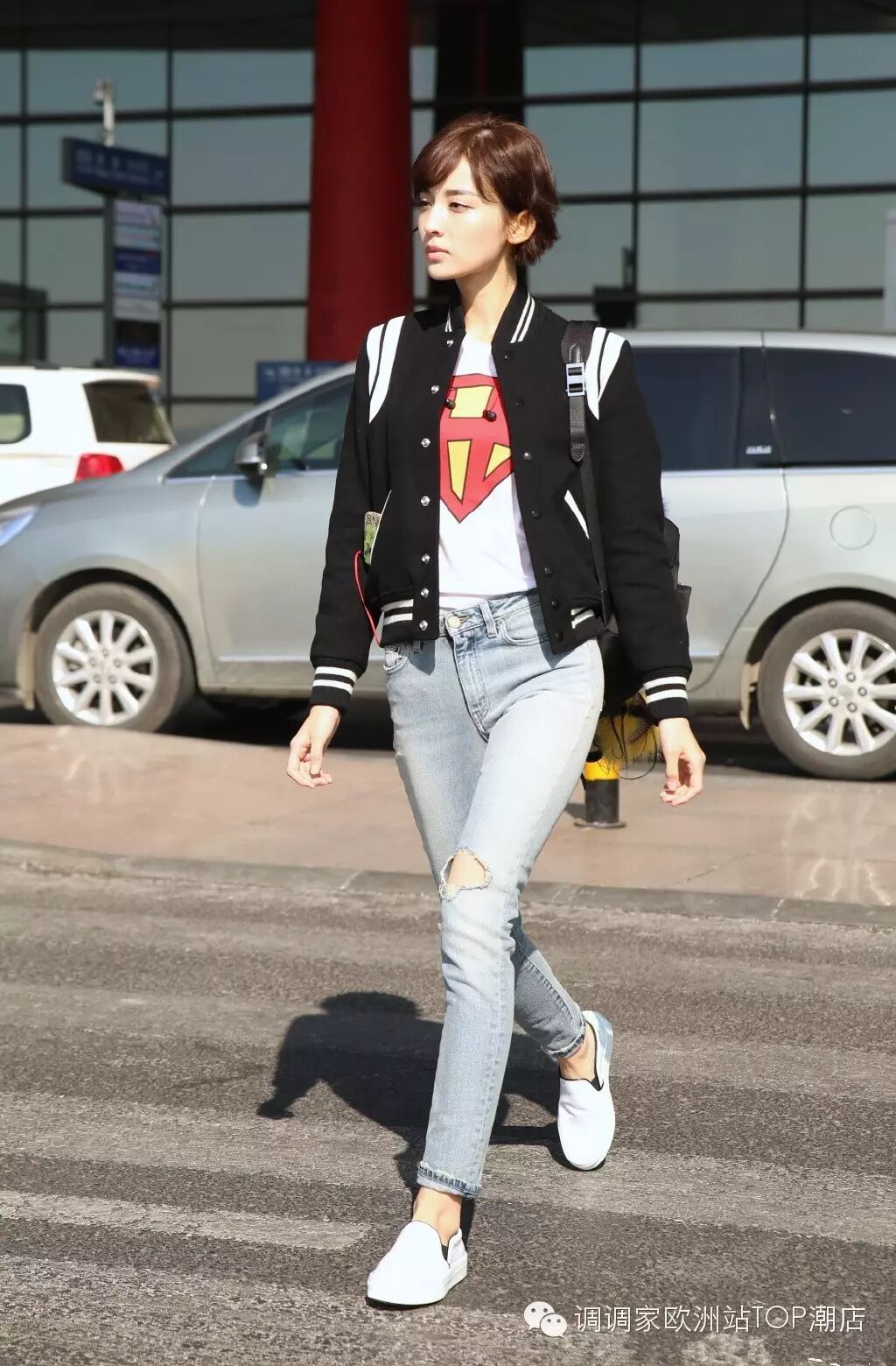 棒球衫什么呢,娜扎也玩过,每一处都应熨服帖,还暗藏小心机。一脚蹬露脚踝显高。