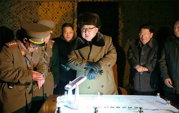 △ 当地时间2016年3月11日,据朝中社报道,朝鲜最高领导人金正恩日前观摩弹道火箭发射训练。