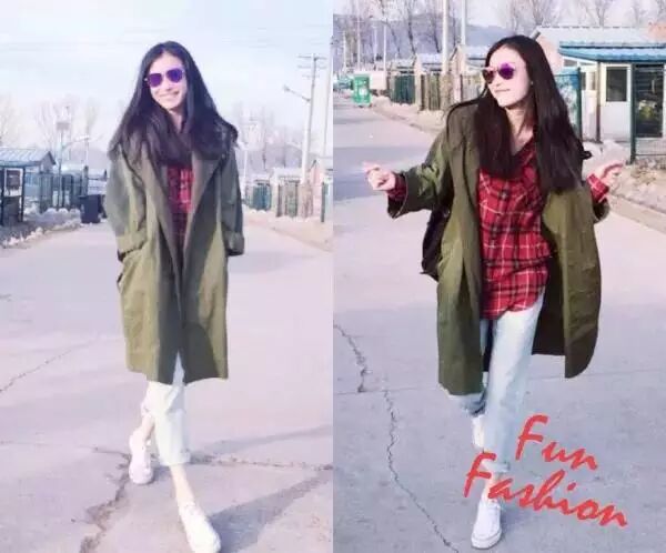 军绿色休闲外套+格子衬衫+浅色牛仔裤+帆布鞋,看着很舒服的小清新风格,有着男孩子般的帅气与阳光,给冬日增添活力。