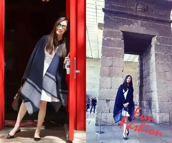 白色连衣裙搭配藏蓝色斗篷披肩,超有文艺气质。