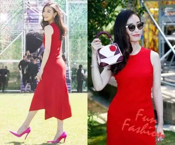 倪妮穿着这条大红裙搭配了一双粉色尖头高跟鞋,配上侧分波浪卷显得着实的妩媚又亮眼。