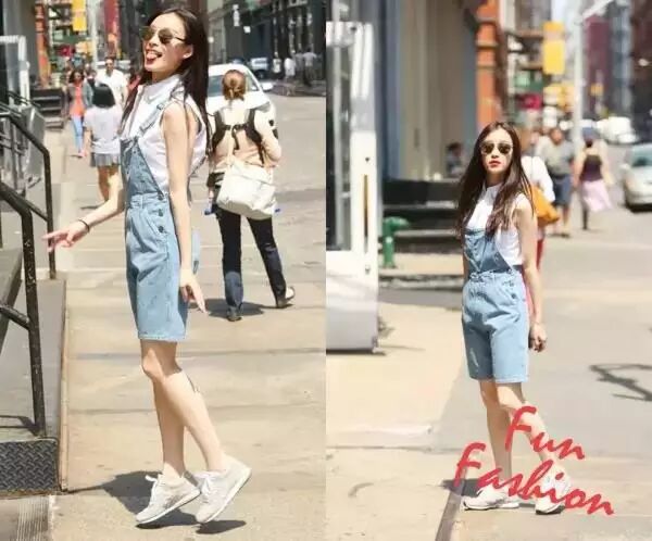 牛仔单品给人一种帅气的感觉,她用牛仔背带短裤搭配白色衬衣,增添不少清新感。
