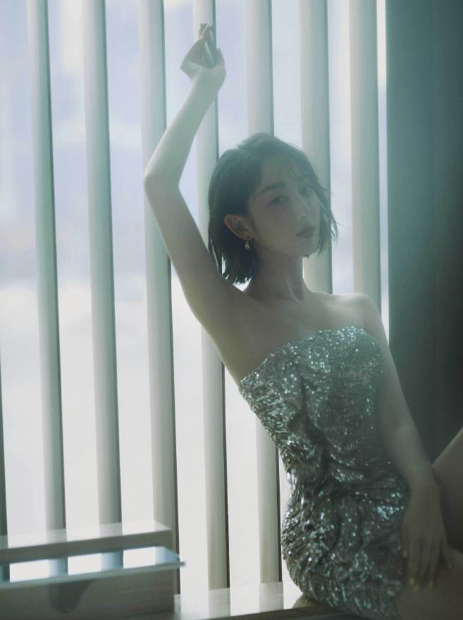 蒋梦婕置身于天台落窗,微卷的碎发,波光粼粼的银色亮片裙于高级朦胧色调中演绎多种情绪,举手投足间展现清冷气质,质感满分。